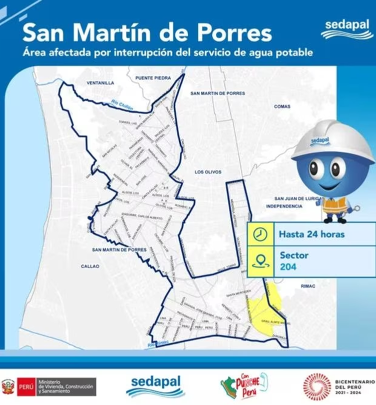 Sedapal anuncia qué zonas de San Martín de Porres han sido afectadas por el corte de agua.